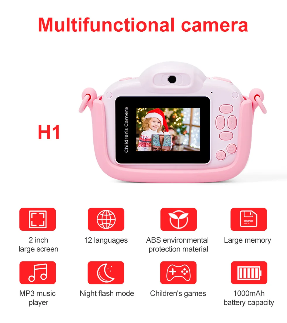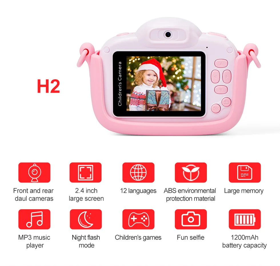 Display Screen: H2:2.4-inch IPS eye protection screen H1/H7:2-inch IPS eye protection screen Pixel: H2:30M/16M/12M/8M H1/H7:20M/18M/16M/12M Photo Resolution: H2:6016*5000/4928*3264/4032*3024 H1/H7:5120*4000/4624*3468/4352*3264 Video Resolution: H2:2.5UHD/1296P/1080P/720P H1/H7:1080P/720P/VGA Language: H2/H1/H7:English, Russian, Italian, Japanese, Korean, German, French, Spanish, Portuguese, Thai, Chinese Simplified, Chinese Traditional Battery Power: H2:1200mAh H1/H7:1000mAh Stickers and Filters: H2:26 H1/H7:39 Support TF Card: Up to 64G Charging Time: 2.5-3 hours (Works for 3-3.5 hours) Charging Voltage and Current: DC 5V/1A Important Tip: the charging must be used by adults or under the monitor of adults.